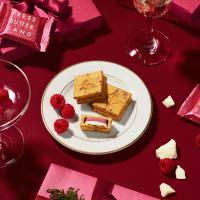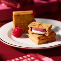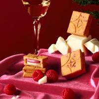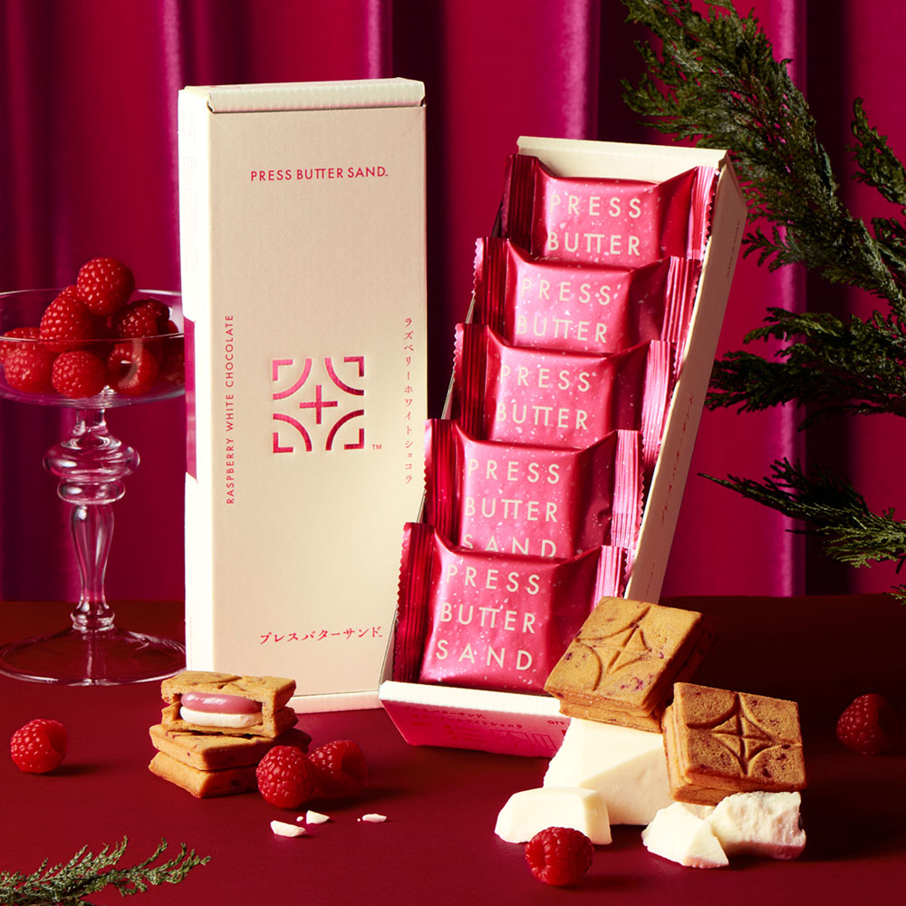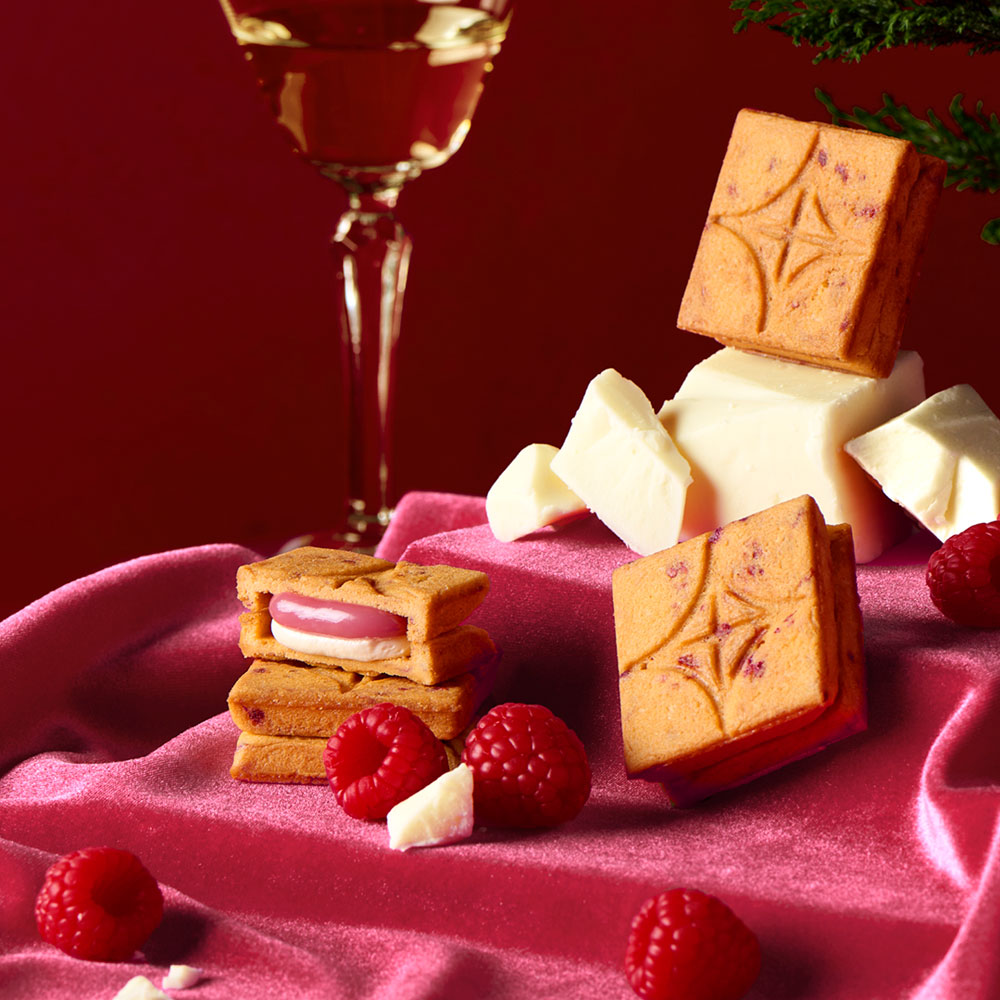 甘酸っぱくフルーティーなラズベリーキャラメルと、ミルキーで風味豊かなホワイトチョコレートを練り込んだバタークリームを、さくさく食感のクッキーで挟みました。フリーズドライのラズベリーを混ぜ込んだクッキー生地は見た目にも華やかでホリデーシーズンにぴったりです。ラズベリーをイメージしたピンクのラインとホワイトチョコをイメージした白いパッケージにキラキラとした光沢のあるシールが、ホリデーシーズンの気分を高揚させます。