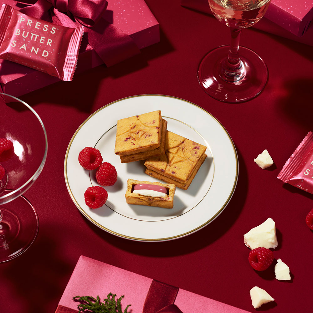 爽やかな酸味と甘さのバランスが絶妙なラズベリーキャラメルと、滑らかでリッチな口当たりのホワイトチョコレートバタークリームが楽しめる贅沢なバターサンド