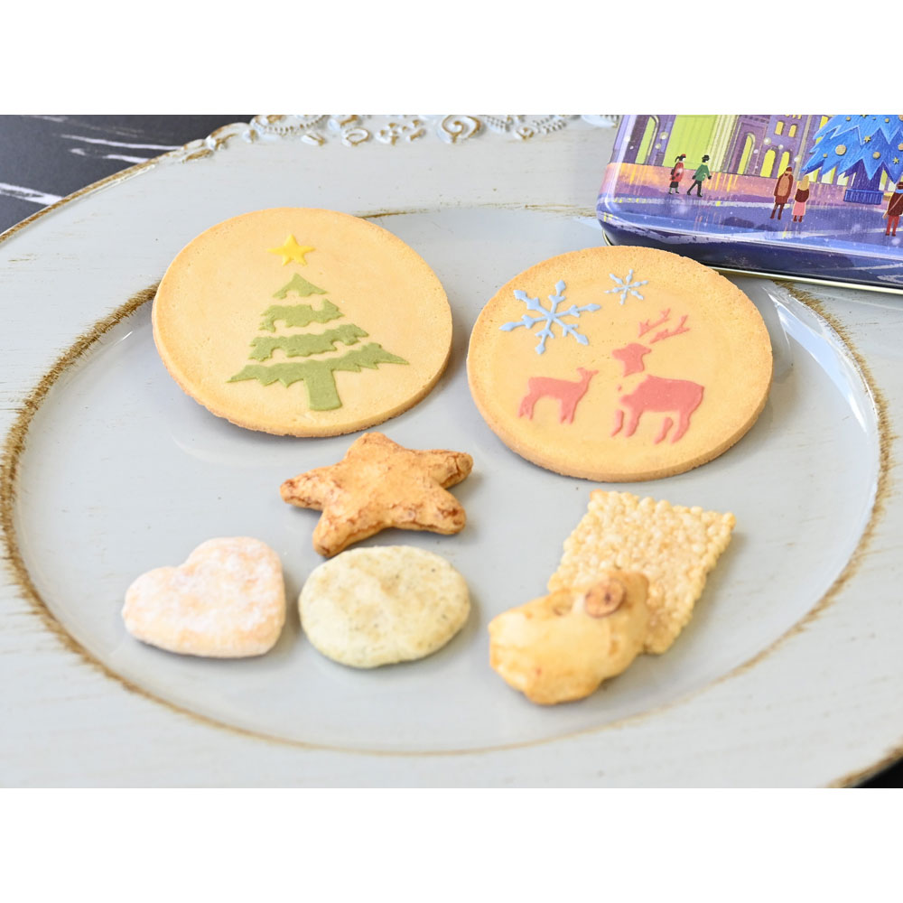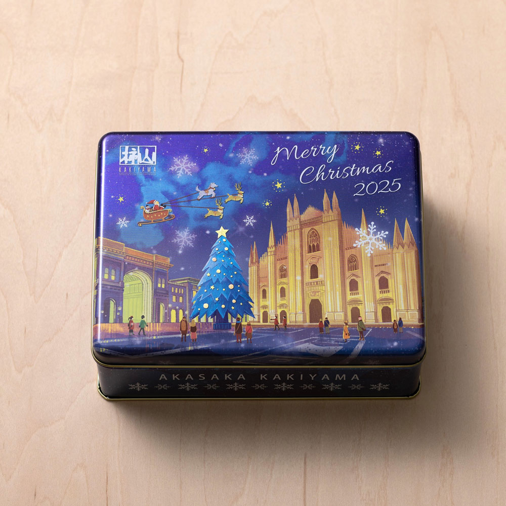 「世界を旅するサンタ」シリーズの2025年は、イタリアのミラノにやってきました。缶のデザインは、毎年人気のイラストレーター・のみやさんの描きおろしです。限定のチーズ味や、ツリーとトナカイの玉子煎餅など、見た目も可愛いあられたちは個包装でシェアしやすいので、ケーキの後のひと時にいかがでしょうか。