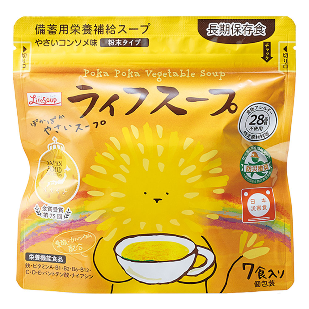 体に大切なビタミンやミネラルがたっぷりで、アレルギー28品目も使っていない粉末タイプの保存食です。お湯または水に溶くだけ。