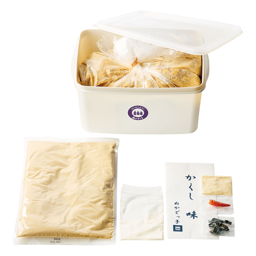 ぬか床3kg、ポリ容器、補充用煎りぬか300g×1袋、かくし味(昆布・きなこ・唐辛子)、鰹カルシウム付