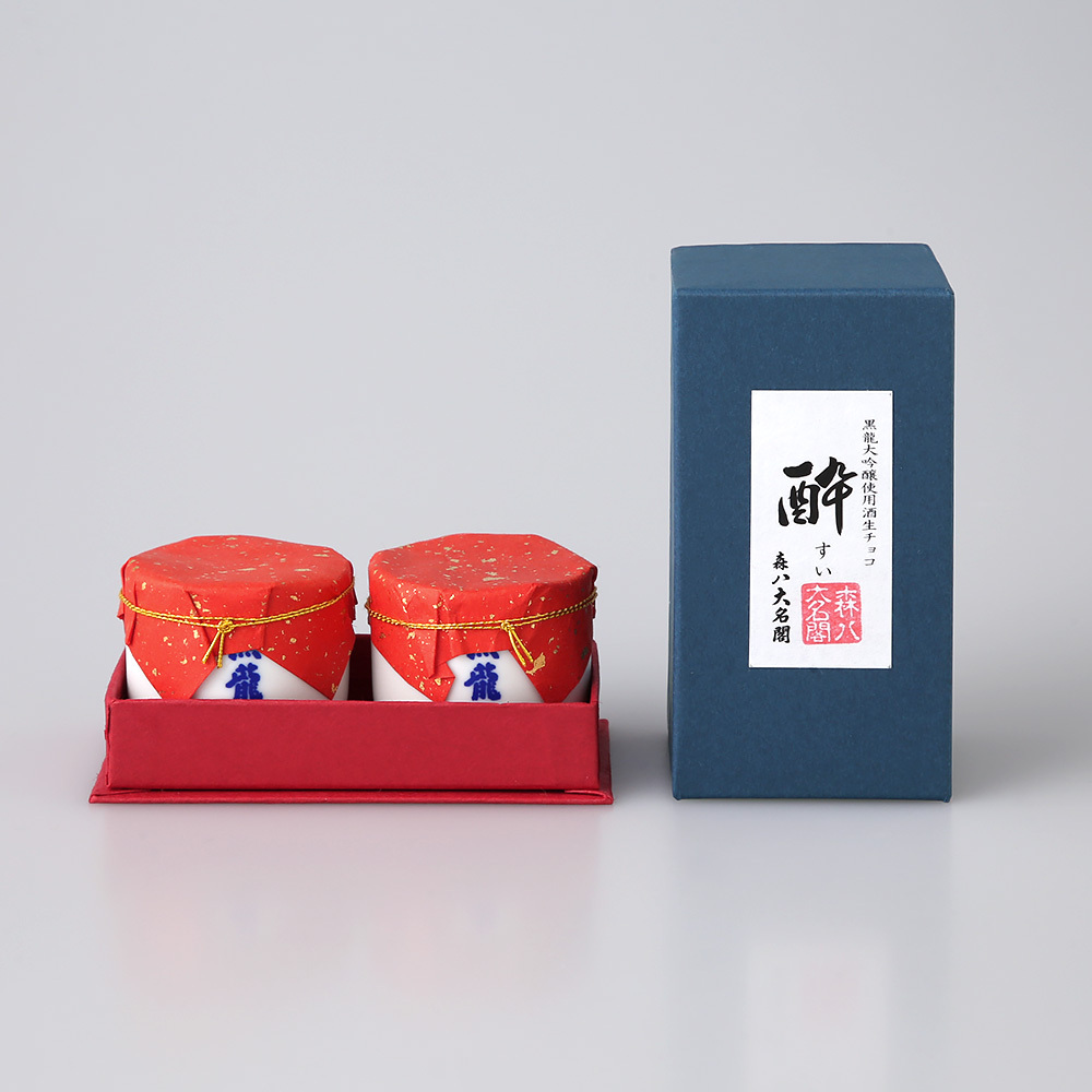 福井の銘酒「黒龍」の大吟醸酒を練り込んだ生チョコレートを白磁の利き酒用豆猪口に流し込みました。豆猪口には黒龍のロゴ入りでお召し上がり後には晩酌にお使いいただけます。