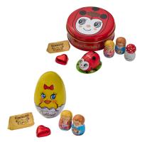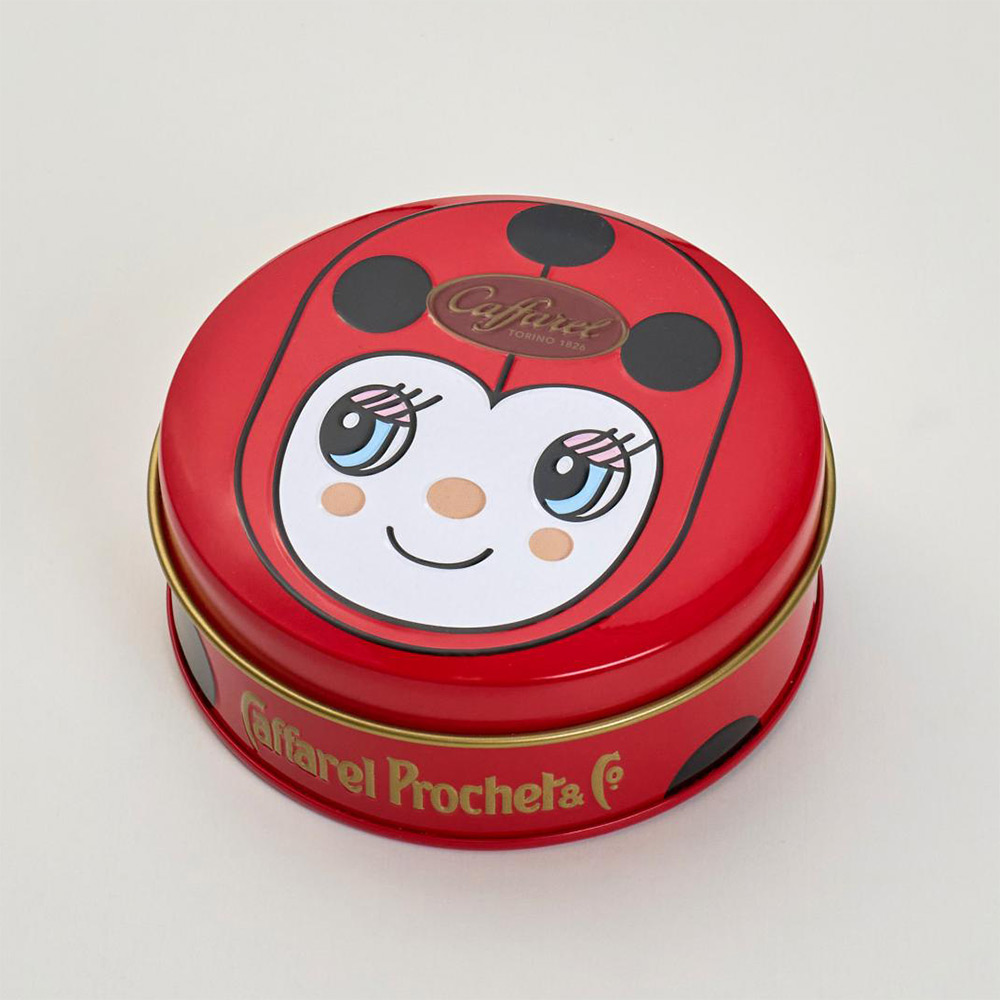 カファレルを代表するてんとう虫モチーフの缶入りチョコレートとひよこ型パッケージのチョコレート。計10粒のチョコレートが入っています。※てんとう虫ときのこのチョコレートの柄はランダムに入っています。