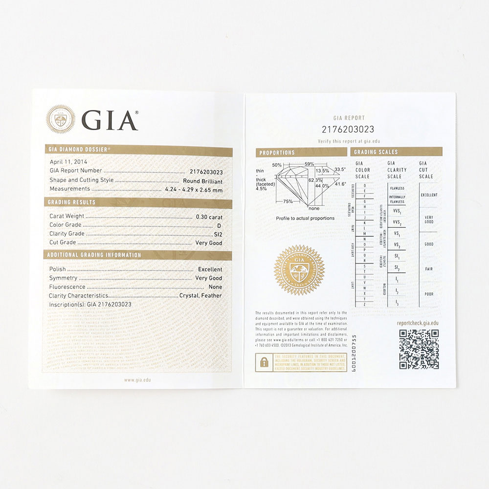 ダイヤ1石約0.3ct(SI2クラス、Dカラー、ベリーグッド)、枠:Pt900約0.2g、チェーン:Pt850約1.2g