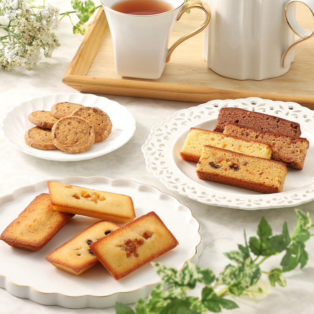 ラムレーズンをはじめバナナの果肉やオレンジピールなど、それぞれをふんだんに使用したフィナンシェ、ふわっと香るラムレーズンのクッキー、上品な甘さのフルーツが主役のフルーツケーキをそれぞれ詰め合わせました。