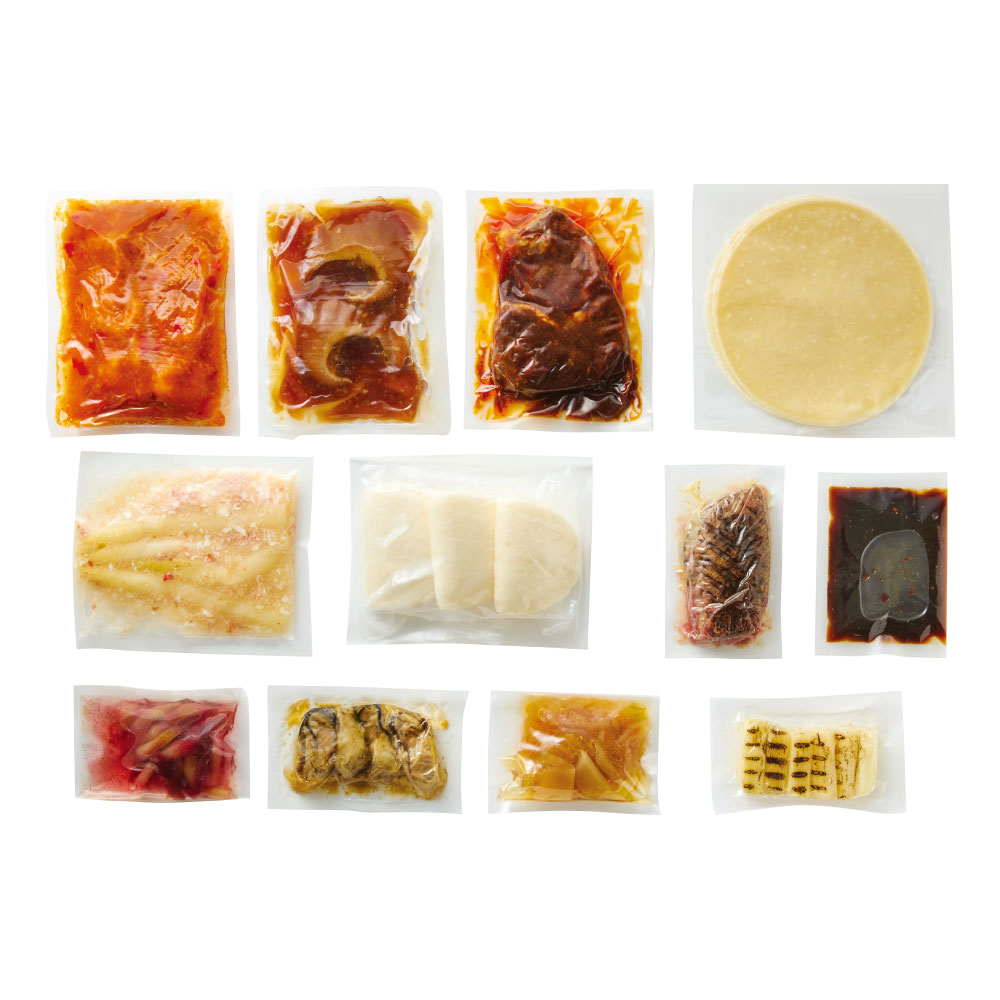 みょうがの馬告甘酢漬け/ザーサイとくらげの甘酢漬け/牡蠣のレモングラスコンフィ/合鴨のクレープ巻き 五香粉香る甜麺醤だれ[合鴨 150g/クレープ 6枚/ソース/焼きねぎ]/ホワイトアスパラガスの蟹あんかけ/フカヒレの醤油煮込み[フカヒレ 2個]/海老のチリソース 290g/牛肉の麻辣煮込み 240g/蒸しパン 3個