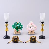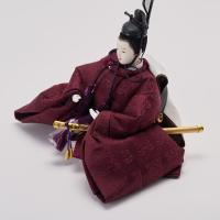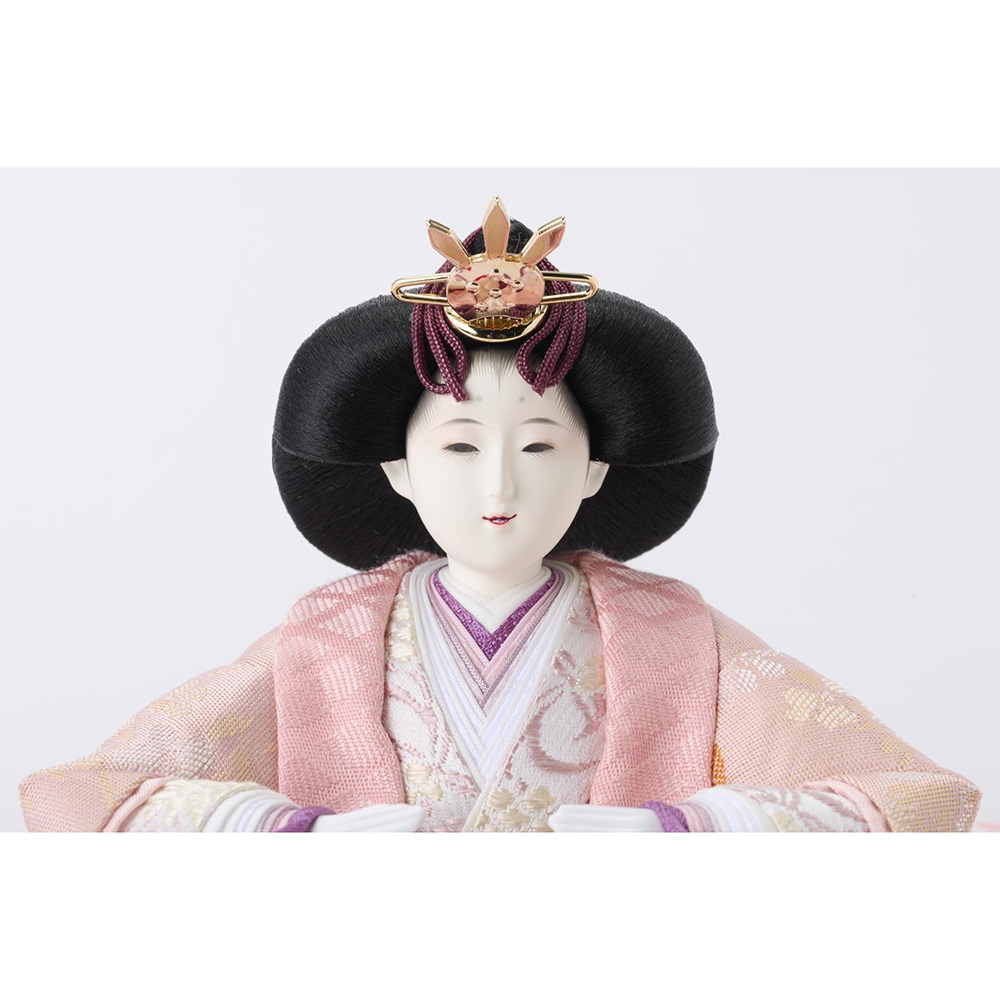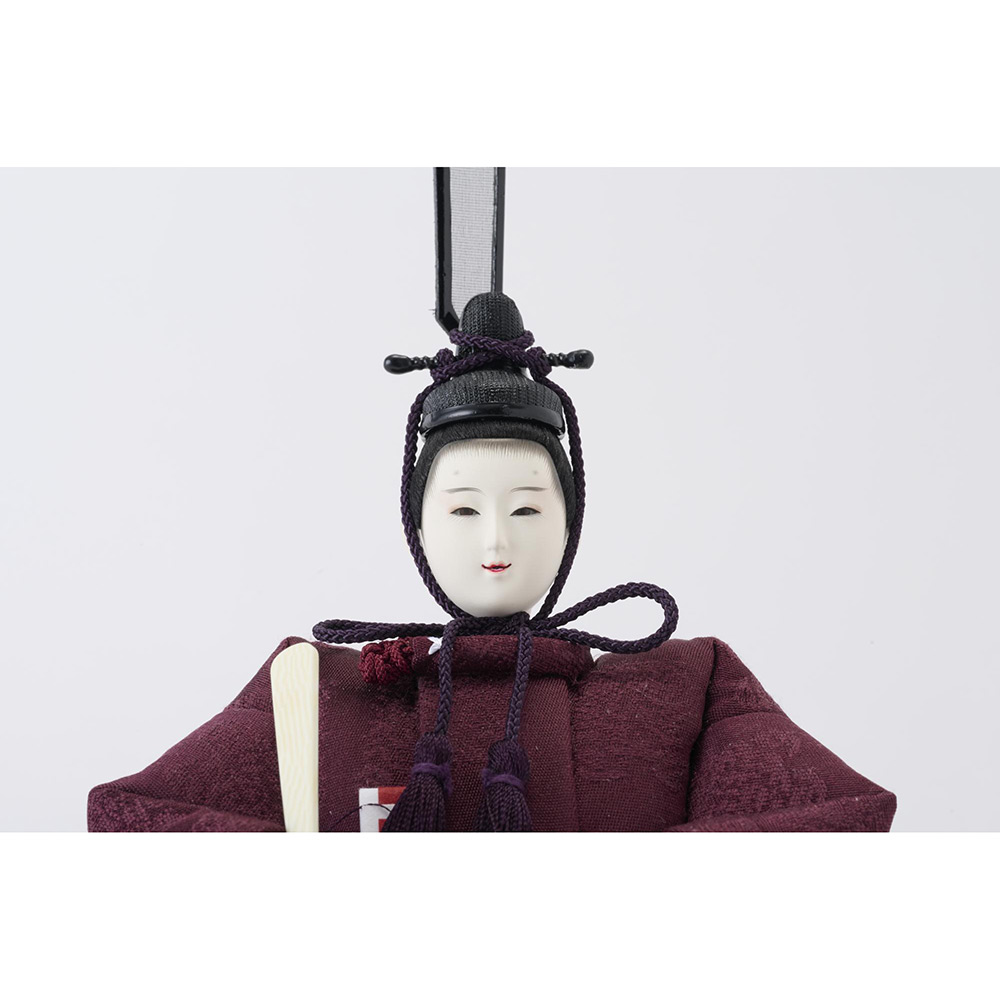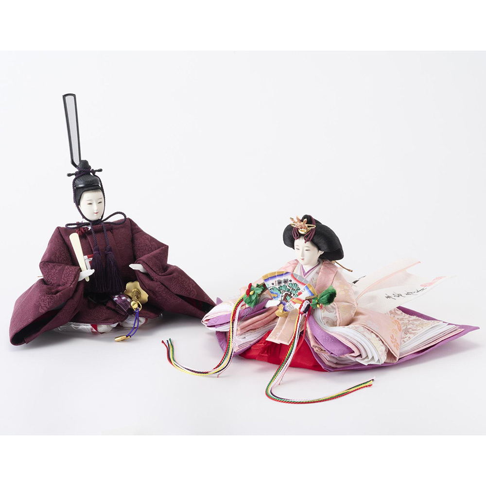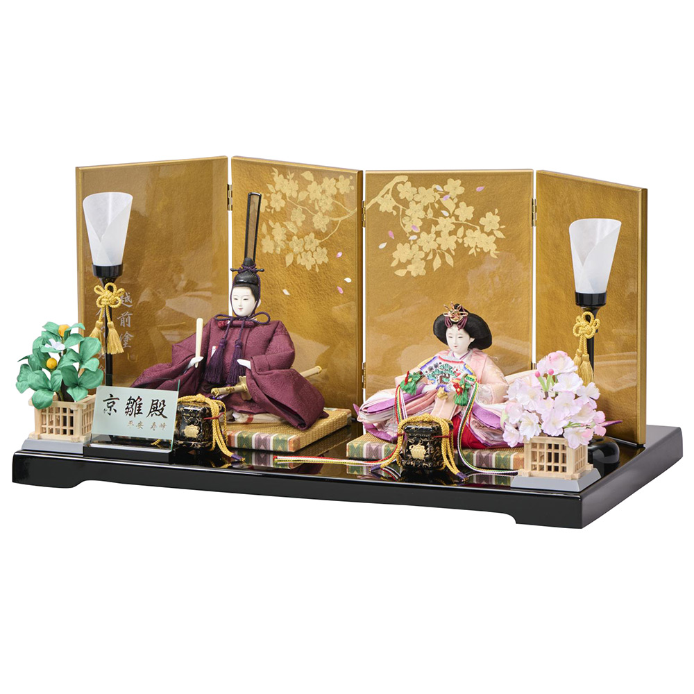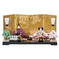 男雛は「桐竹鳳凰」、女雛の単衣は高貴な紫を。螺鈿の花びらをあしらった屏風に美しく映えて。