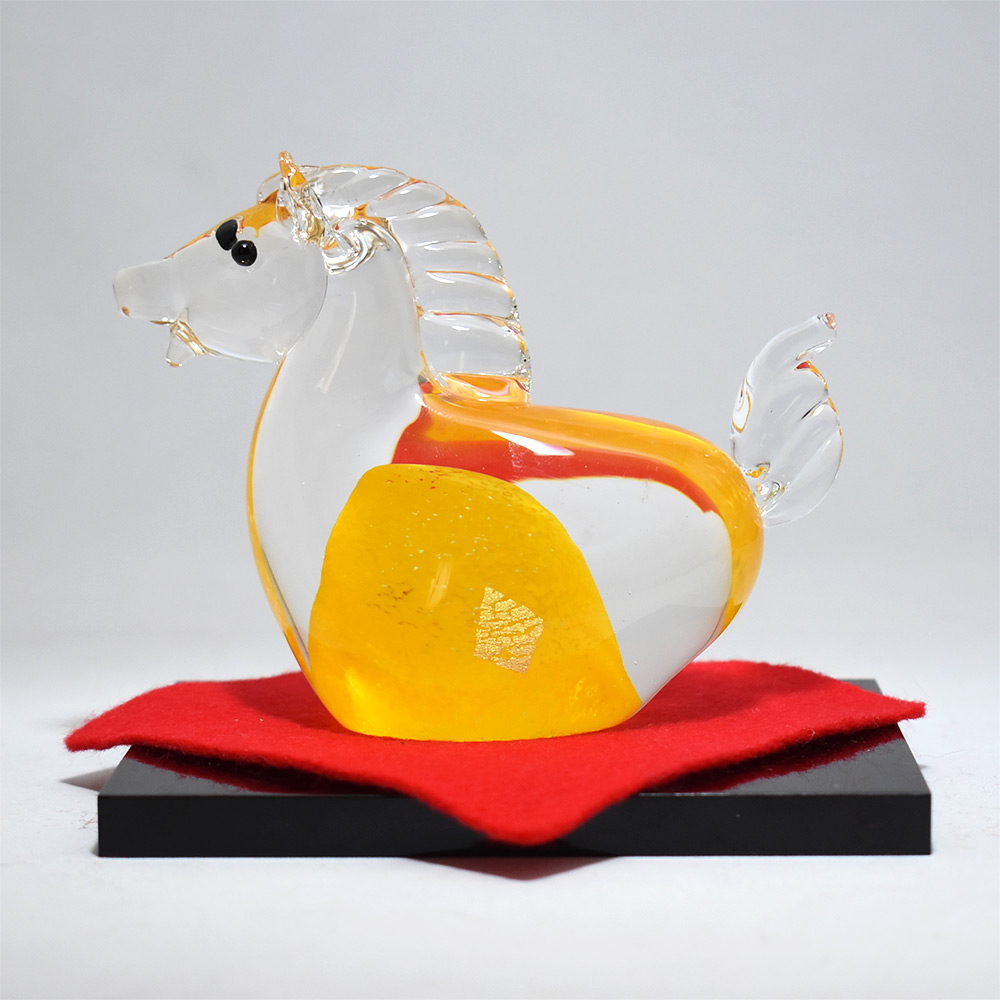 ガラスの透明感、美しさを追求し、一つひとつ丁寧に仕上げられた粋工房の干支です。太古より左を向いた馬は 「右に出る者無し」に通じ大吉兆とあがめられてきました。また、 十二支の第七 「午」 は大変明朗な性格と行動力を持ち明るい家庭と長寿 ・ 健康を運んでくれる丈夫で賢い動物です。