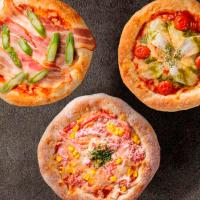 紅ずわいがにとコーンのピザ270g×1、のどぐろとトマトのピザ280g×1、ベーコンとアスパラのピザ285g×1