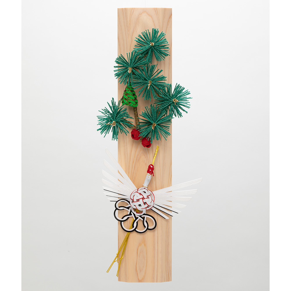 檜の板に、水引の松と鶴で彩られた清々しいお飾りです。立体的に削られた檜が角度によって表情を変え、空間に一層の華やぎを演出します。