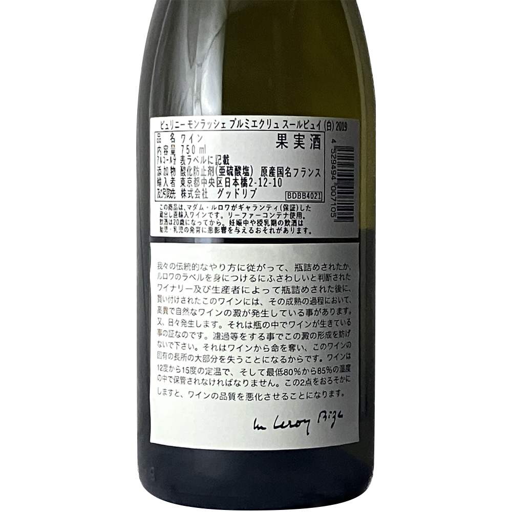 2019 ピュリニー モンラッシェ プルミエクリュ スールピュイ(白) 750ml × 1本