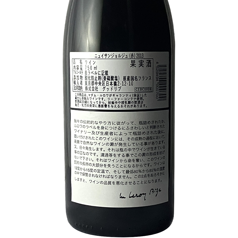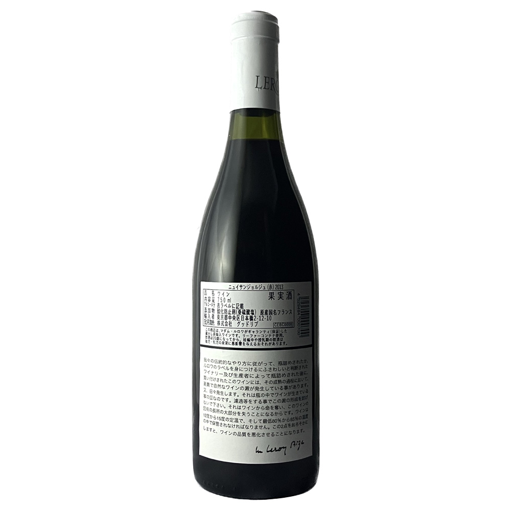 マダム・ルロワの厳しいテイスティングによるチェックの上で買い求めた良質のワインを、飲み頃を迎えるまでルロワ社のセラーで熟成。深い味わいを追求したトラディショナルなスタイルのワインです。ニュイ サン ジョルジュ村はコート ド ニュイ中央から南部に位置し、特級畑に匹敵すると高い評価を得る数多くの1級畑をもちます。2013年は柔らかく伸びる酸味が特徴的で、程よい骨格とミネラルを感じるミディアムボディ。早くから楽しめるヴィンテージの1つです。