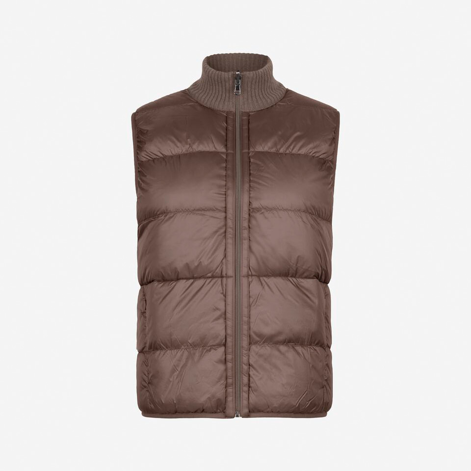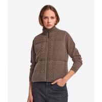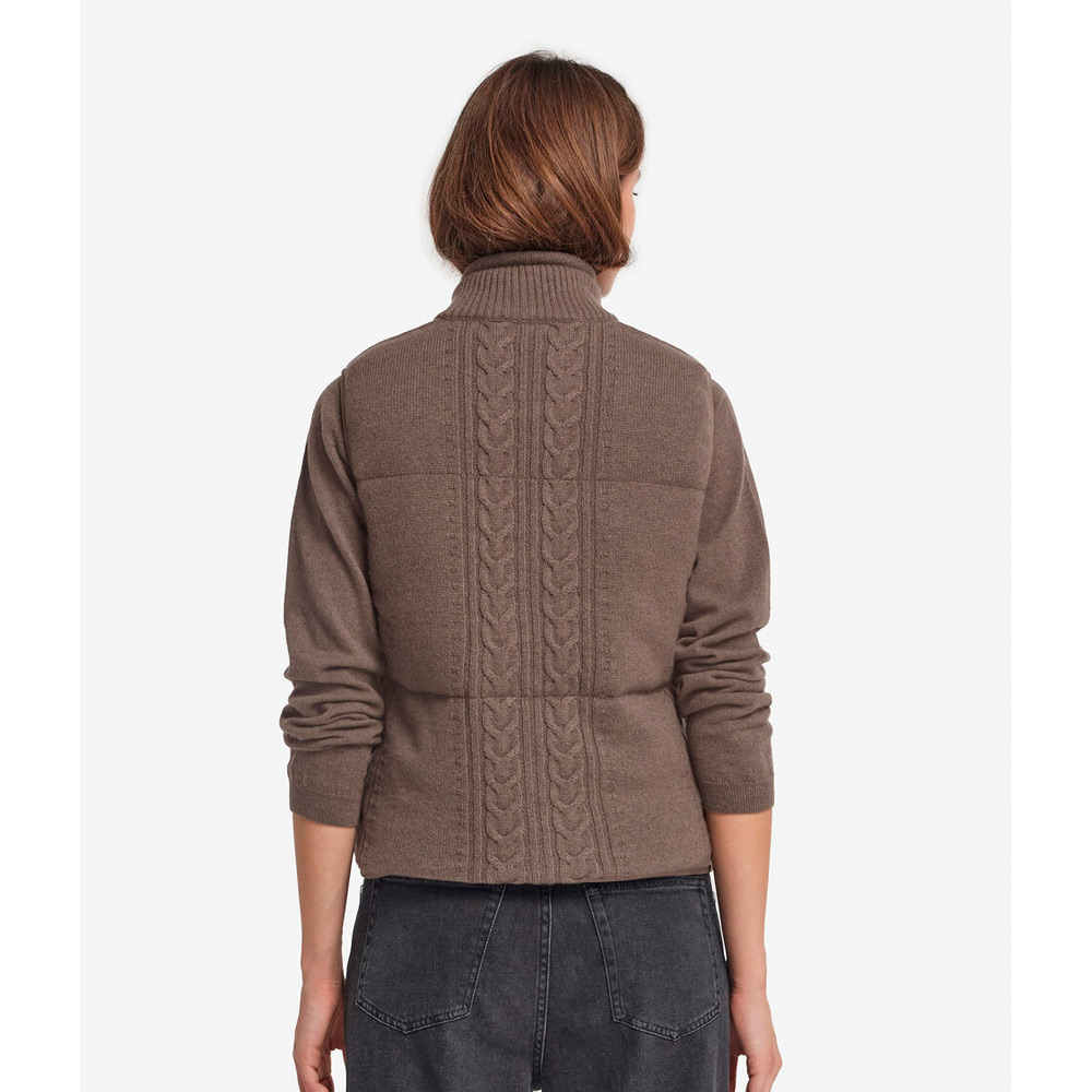 ジャージ素材やニットのウェアと合わせて着るのに最適なダウンベスト。クラシカルで上品なデザインでありながら、程よくカジュアルなテイストが効いた一枚です。片面は上質なカシミヤ素材のケーブル模様入りニット、もう片面は現代的な装いを演出するテクニカルファブリックを配したリバーシブルのモデル。金属のファスナーがアクセントとして映え、ウルトラソフトカシミヤで作られた柔らかいハイネックの襟が、首を暖かく包み込みます。どのようなシーンでも暖かくスタイリッシュに着られるアウターとして活躍します。
