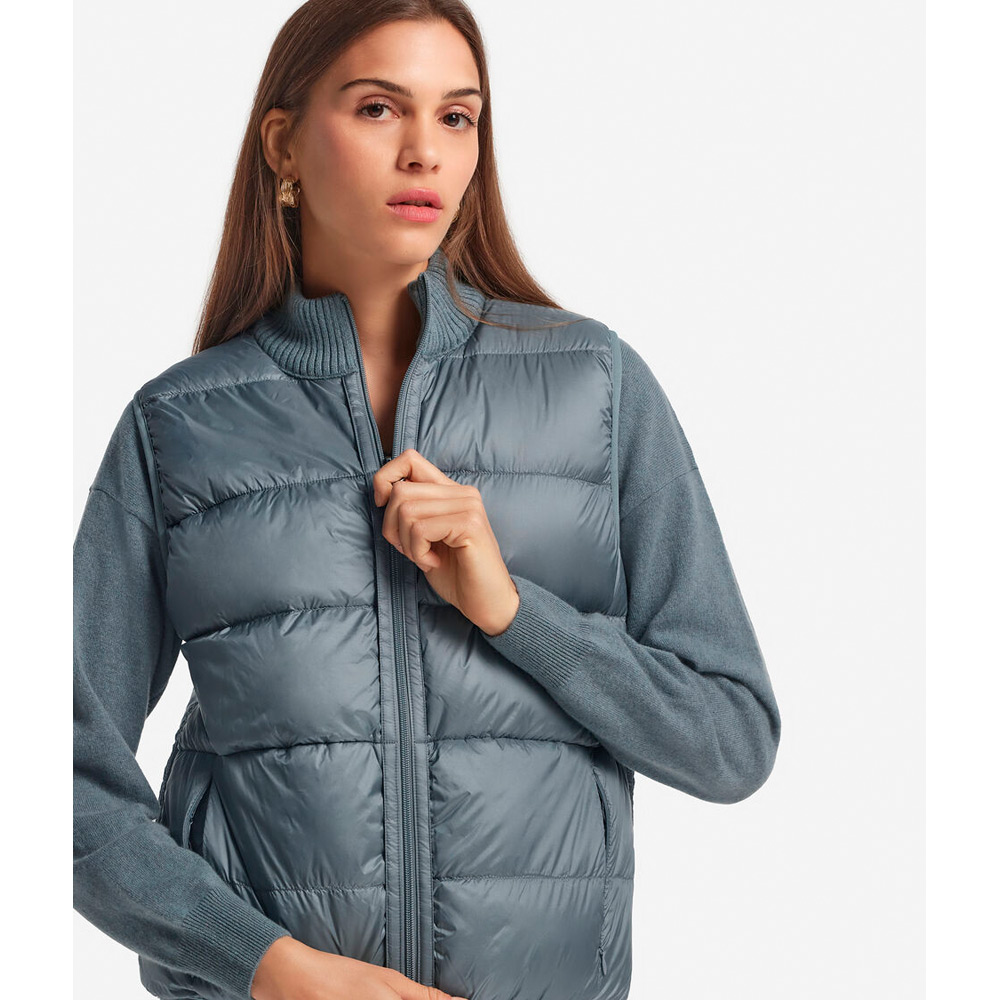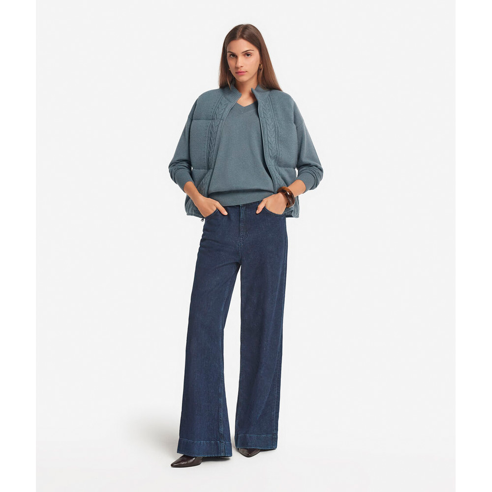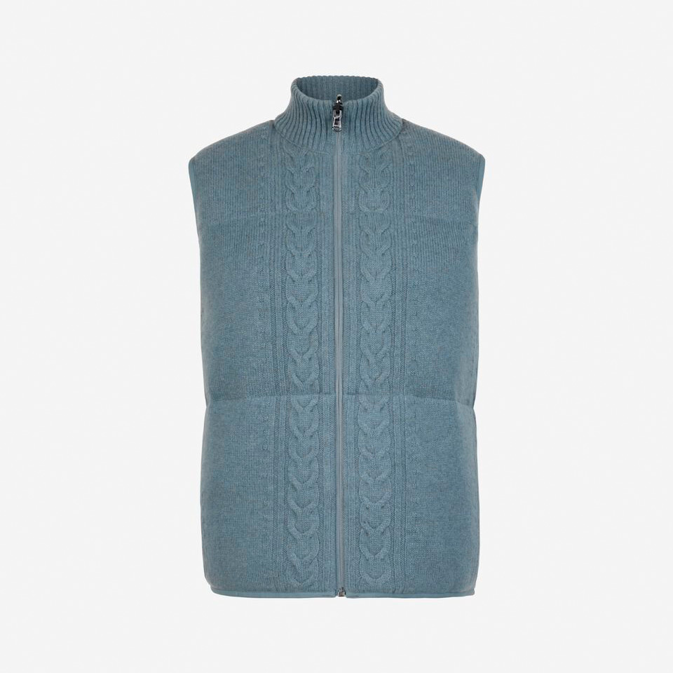 ジャージ素材やニットのウェアと合わせて着るのに最適なダウンベスト。クラシカルで上品なデザインでありながら、程よくカジュアルなテイストが効いた一枚です。片面は上質なカシミヤ素材のケーブル模様入りニット、もう片面は現代的な装いを演出するテクニカルファブリックを配したリバーシブルのモデル。金属のファスナーがアクセントとして映え、ウルトラソフトカシミヤで作られた柔らかいハイネックの襟が、首を暖かく包み込みます。どのようなシーンでも暖かくスタイリッシュに着られるアウターとして活躍します。