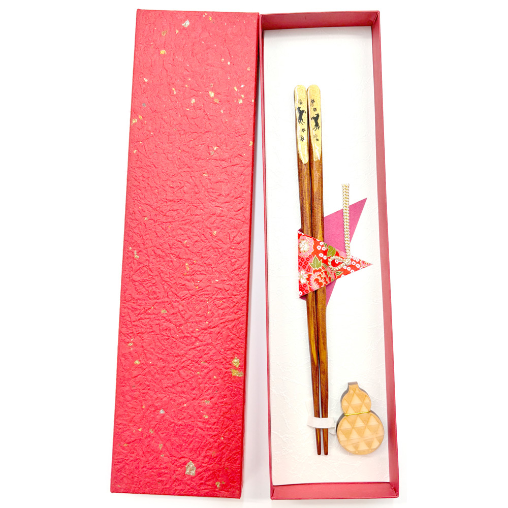 木地の中で極めて軽く、かつ丈夫な「あすなろ材」をお箸に使用し、お箸の天削げ部には、2026年の干支の「午」と「桜」のデザインを施しました。セットのお箸置きは、古来より除災招福のお守りや魔除けとして用いられてきた瓢箪をモチーフにしました。干支箸(えとばし)は、その年の干支(十二支)が描かれた箸で、「健康長寿」や「新しい年に良い縁を結ぶ(橋渡し)」などの意味が込められた縁起物です。新しい年の始まりにご家族やご友人との絆を深める贈りものとしても人気があります。
