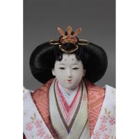 ピンクの刺しゅうが施された屏風と飾台が優しく感じられ、衣装には西陣織を使用した可愛らしいお飾りです。