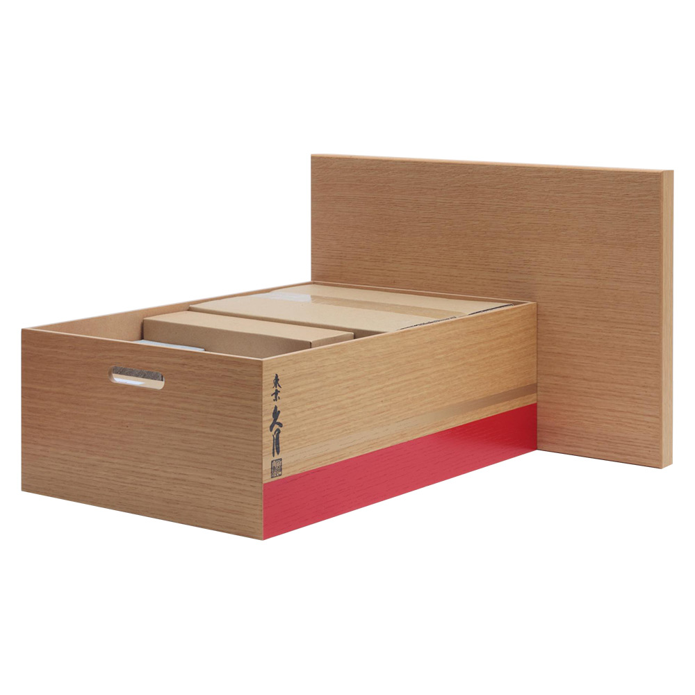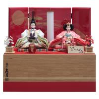 赤色の屏風と、楢を素材にした収納箱、淡い色合いのお雛様。それら全てがバランスよく整えられた収納飾りです。