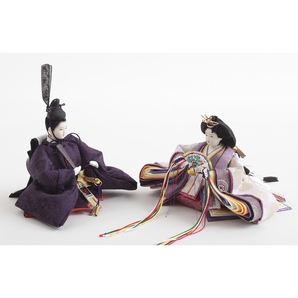 屋久杉を飾り台と屏風に使用。お人形の衣裳は高貴な色とされ貴族に用いられた紫を基調とし、上質感のある仕立てです。
