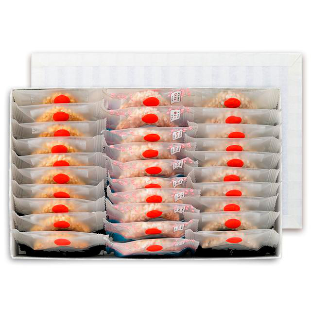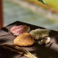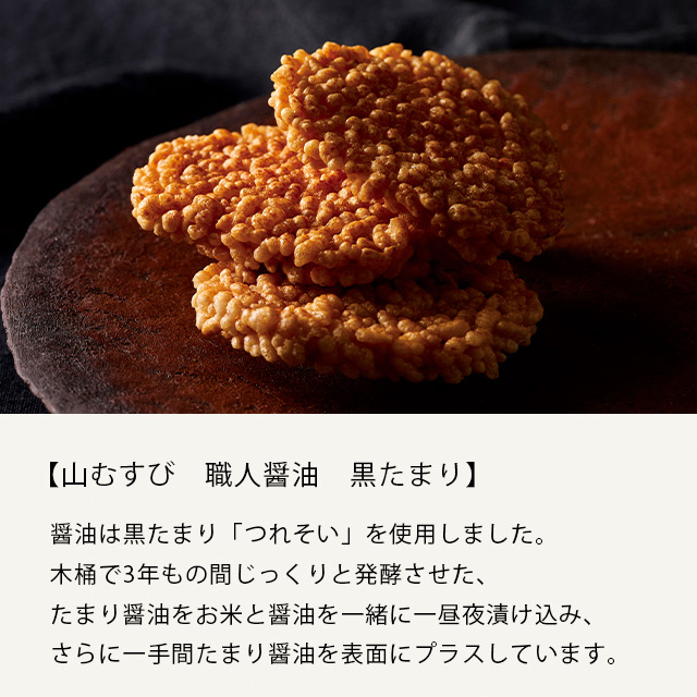 風味豊かで栄養価の高い穀物を、軽やかな食感のおせんべいに仕上げた五穀せんべい「山むすび」。全国のこだわり醤油の中から、山むすびのために厳選された醤油を使用した「黒たまり」、国産の7種類の穀物を使用した「七福米塩」、紀州南高梅を使用した「梅かつお」の3種類を詰め合わせました。