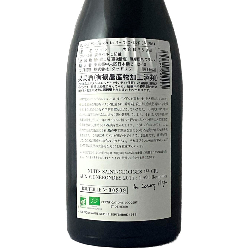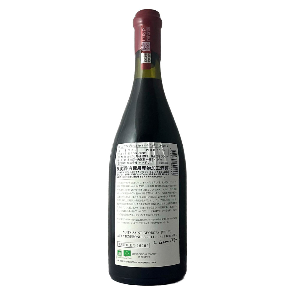 ルロワ社が所有し、ビオディナミ農法を実践する畑で収穫されたブドウを醸造。収量は少なく、ブドウにはヴィンテージの特徴とテロワールの個性が携わり、ワインの味わいに反映されます。ニュイサンジョルジュの北側に位置する1級畑。黒い果実や湿った動物の皮を連想するような野性の香り。10年の熟成を経て柔らかさを帯び始めました。長期熟成のポテンシャルを感じさせてくれるワインで、これからの熟成も期待できます。抜栓後は時間をかけてゆっくりとお愉しみください。