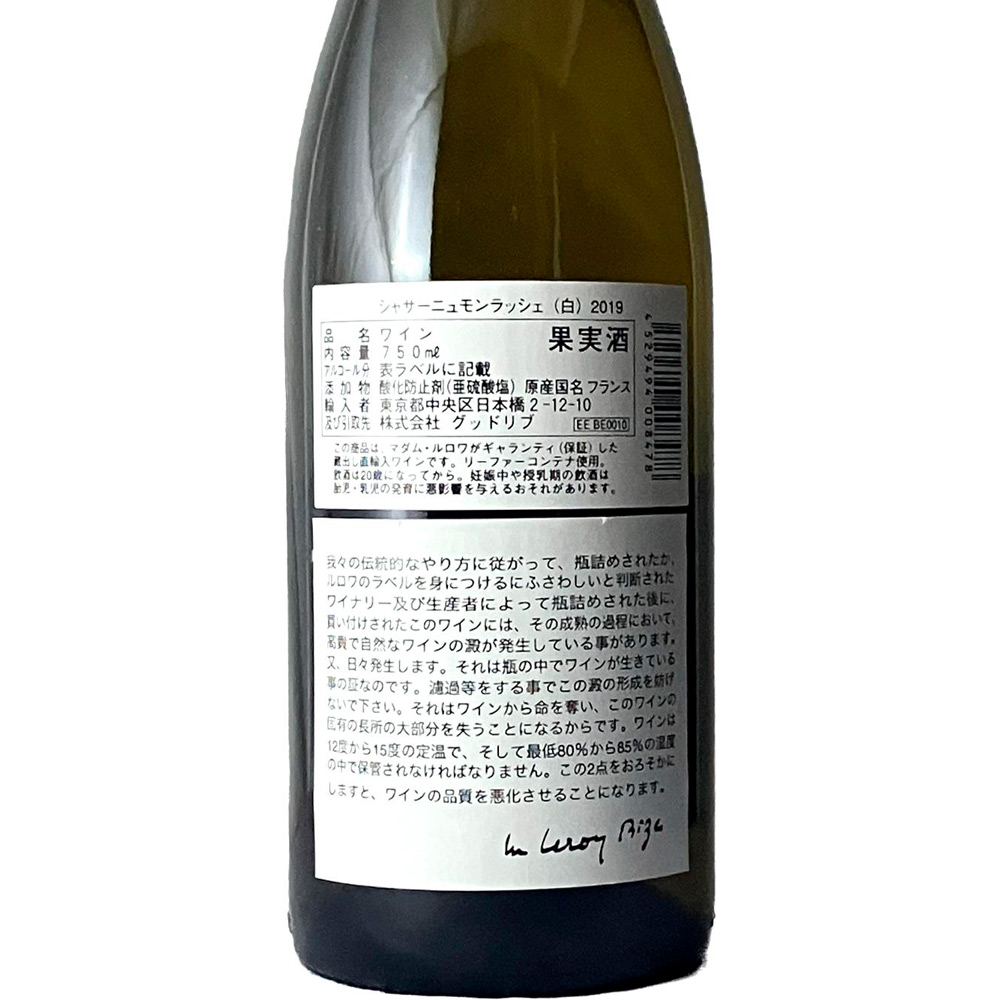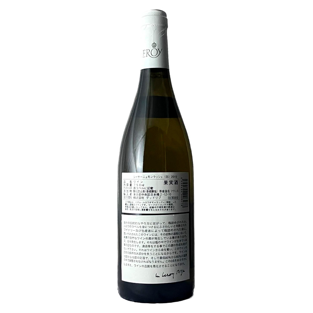 マダム・ルロワの厳しいテイスティングによるチェックの上で買い求めた良質のワインを、飲み頃を迎えるまでルロワ社のセラーで熟成。深い味わいを追求したトラディショナルなスタイルのワインです。ピュリニー モンラッシェと並び、世界最高峰と呼び声高い特級畑モンラッシェを有する銘醸村。2019年の伸びやかな酸味が特徴的なヴィンテージ。白い果実のフレッシュな味わいが、柑橘類を思わせるピュアな酸味と共に広がります。