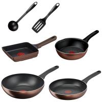 IH・ガス対応の深型とフライパンの3枚セットに、エッグパン、ターナーとレードルをセット。