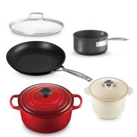 <セット内容>シグニチャー ココット・ロンド 24cm チェリーレッド×1、TNS ミルクパン 16cm NC×1、ココット・エブリィ 18 デューン×1、TNS シャロー・フライパン 28cm NC×1、TNS ガラスフタ 28cm×1
