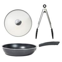 IH対応の人気の26cmサイズのフライパンにガラス蓋とシリコーントングをセットにしました。熱伝導性に優れ、軽量なアルミボディはどんな料理にも使いやすい。IHを含む全ての熱源に対応。握りやすいステンレス製ハンドル。