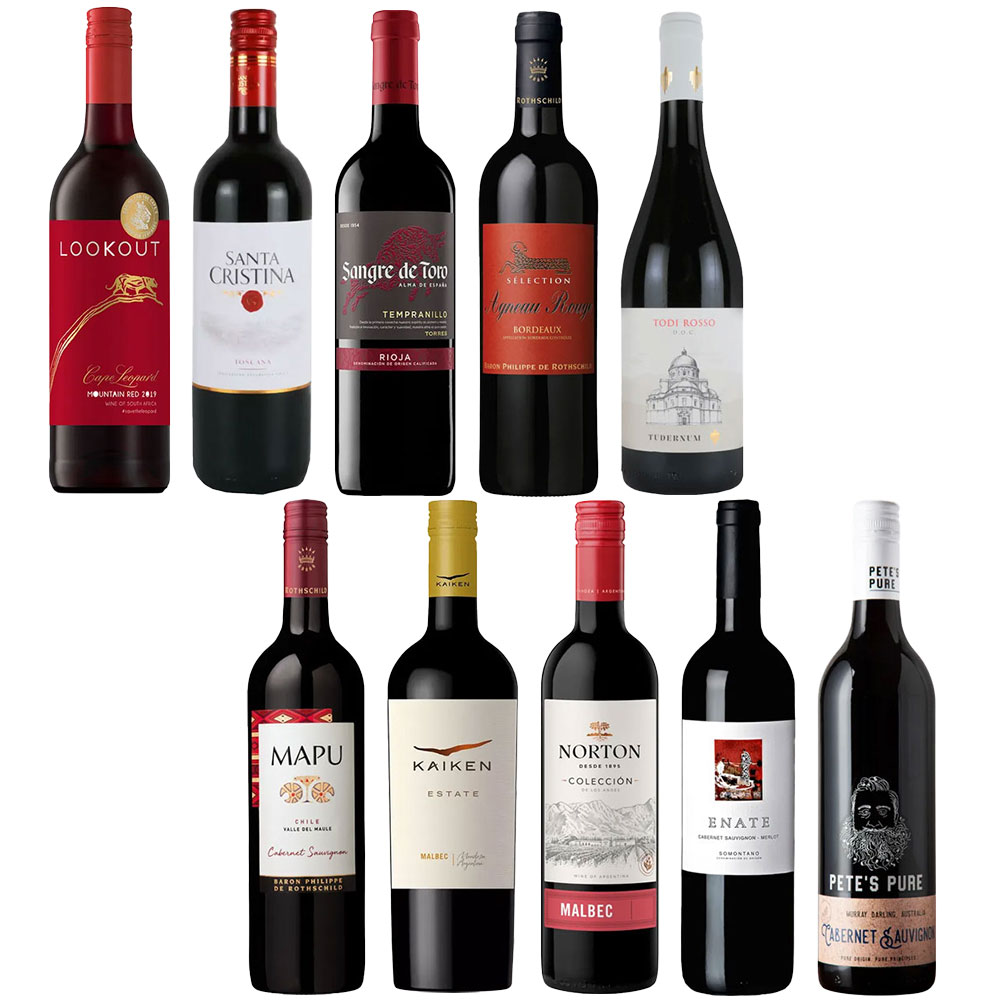 赤ワイン:ルックアウト・ケープ・レオパード・マウンテン・レッド/レオパーズ・リープ、サンタ・クリスティーナ・ロッソ/サンタ・クリスティーナ、サングレ・デ・トロ・テンプラニーリョ/トーレス、セレクション・アニョー・ルージュ/バロン・フィリップ・ド・ロスチャイルド、トーディ・ロッソ/カンティーナ・トゥデルナム、マプ・カベルネ・ソーヴィニヨン/バロン・フィリップ・ド・ロスチャイルド・マイポ・チリ、カイケン・エステート・マルベック/カイケン、コレクシオン・デ・ロス・アンデス・マルベック/ボデガ・ノートン、カベルネ・ソーヴィニヨン・メルロ/エナーテ、ピーツ・ピュア・カベルネ・ソーヴィニヨン/ピーツ・ピュア 各720ml 計10本