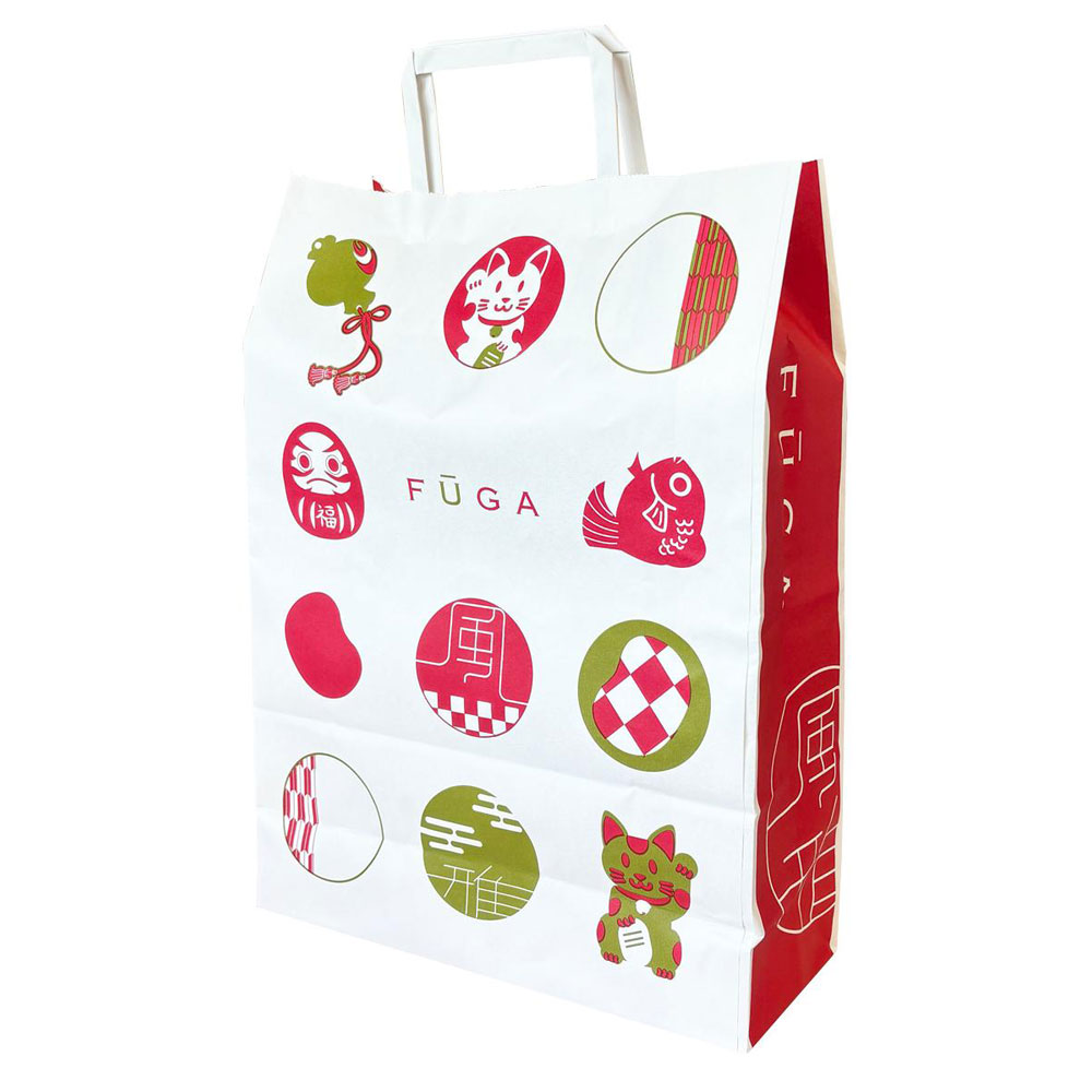 風雅巻き2種類2袋と人気の詰合せ箱を、お正月にぴったりの可愛いオリジナル手提げ袋に詰めました。