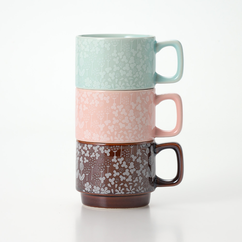 フィンランド語で「乾杯」を意味するkippis。一日の終わり、ほっと解き放たれるような感覚をくれる「乾杯」の瞬間は、日々の暮らしのごほうびのようなもの。そんな時間に使いたくなるようなマグカップを3個セットでご提供します。小ぶりながら手の中にすっぽり収まるサイズ感は、温かい飲み物が欲しくなるこれからの寒い季節にぴったりです。元気いっぱいに咲く北欧の野原の花々がデザインされた艶感のあるカラーリングは、ピンク、ブルー、アメ色と3色色違いでご家族でシェアしても、その時の気分で変えても楽しめます。重ねて収納出来るスタッキングタイプなので場所も取らず、食器棚の中でもちょっとしたアクセントになります。
