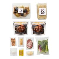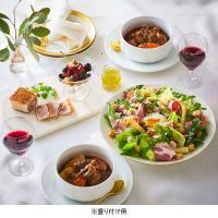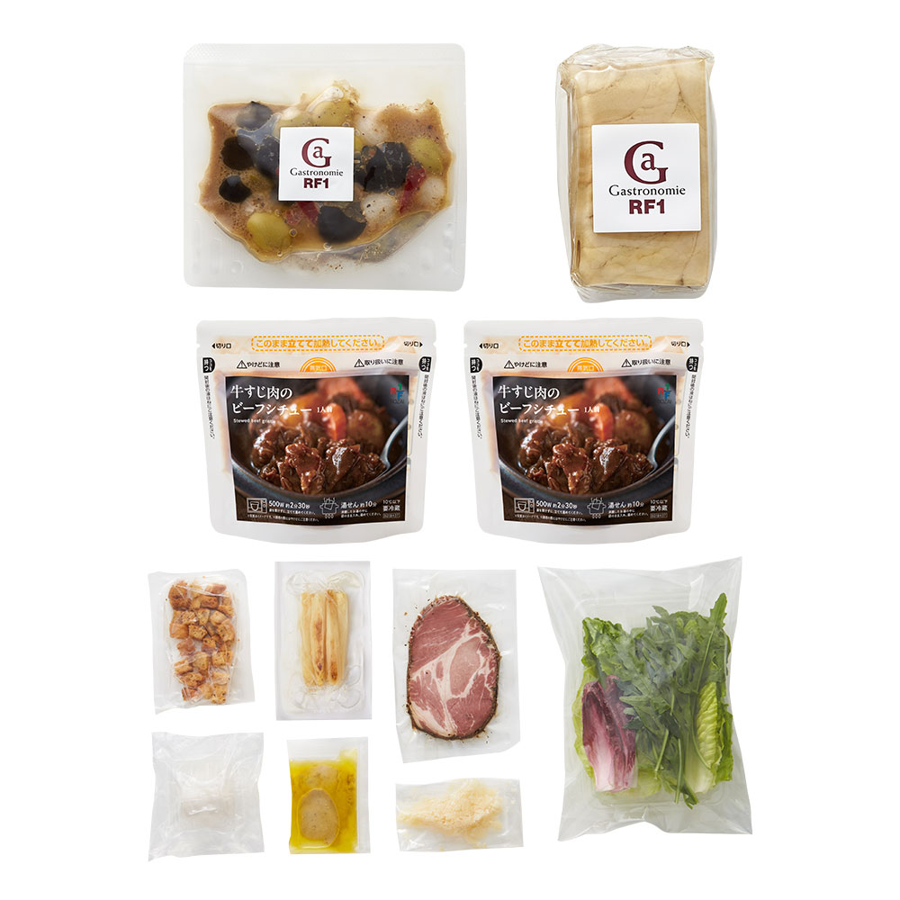 牛すじ肉のビーフシチュー1人前×2、自家製黒胡椒ハムとホワイトアスパラのシーザーサラダ、パテ・ド・カンパーニュ(100g)、オリーブ・アンチョビ(90g)×各1