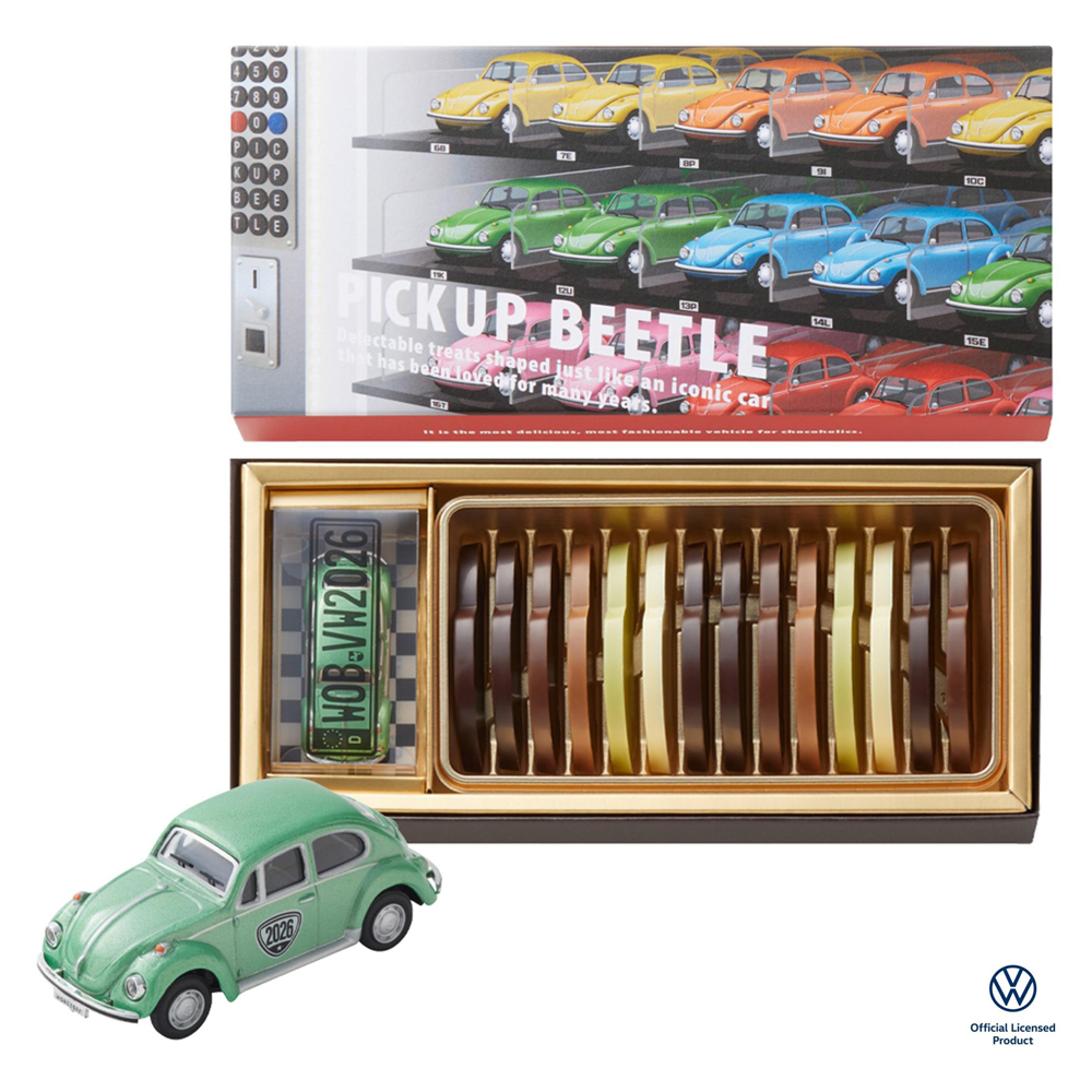 メタリックグリーンのビートルミニカー付き。5つの味わいからピックアップして楽しめるビートルシルエットのチョコレート