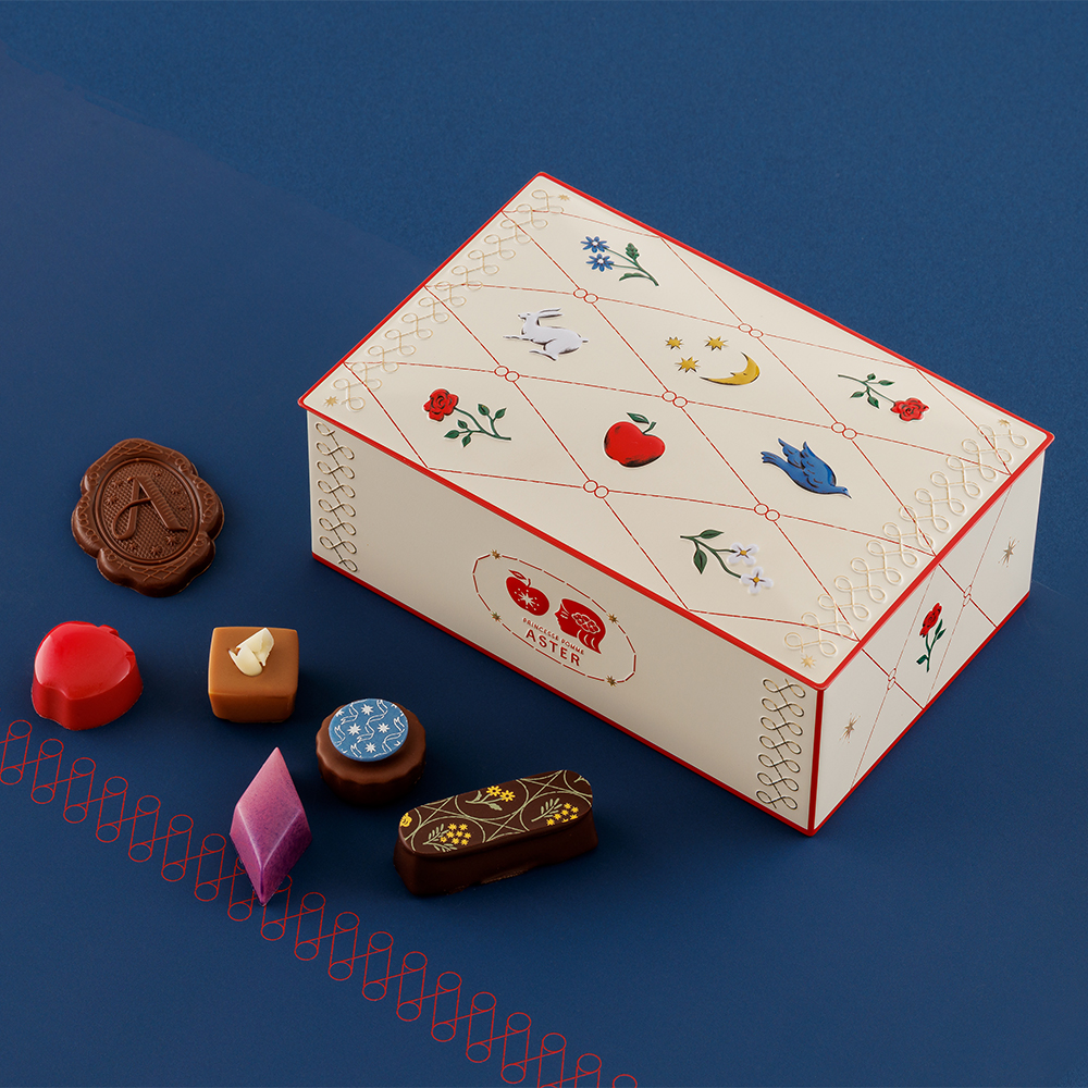 ときめきあふれるアステルの世界を、ぎゅっと詰め込んだ缶。蓋のカーブが美しい高さのある缶は、アステルの世界観をチョコレートで楽しんだ後、今度は自分のときめきを大切に閉じ込めておくなど、後使いを楽しめます。下段にはブランドのキーとなる「星をまとったりんご」や、アステルの歌で咲いた「ミモザ」をイメージした味わいなど。上段には星空の輝きを思わせるひし形チョコレートと、アステルのイニシャル「A」をあしらった繊細なデザインの薄型チョコレートを詰め合わせました。<ブランドストーリー>赤い果実、甘い魔法。りんごに恋した女の子。100年に一度の星降る夜に現われた、たったひとつの煌めくりんご。ひと口かじったそのときから、アステルの世界は、まるで魔法にかけられたよう。赤い果実に恋したアステルは、いつしかりんごひめと呼ばれるようになりました。