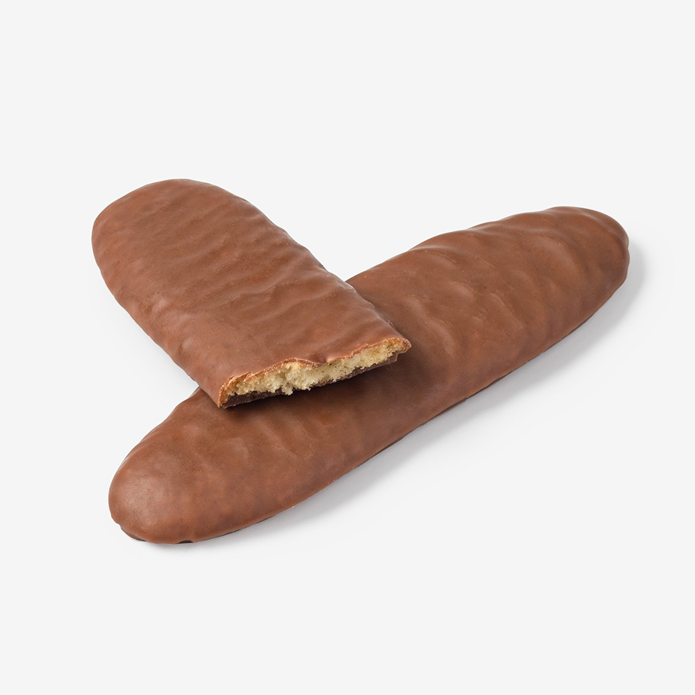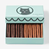 ラング・ド・シャとはフランス語で「猫の舌」。猫の舌の形をしサクサクのビスキュイをダークチョコレートとミルクチョコレートでコーティングし、可愛い黒猫が描かれたBOXに詰め合わせました。