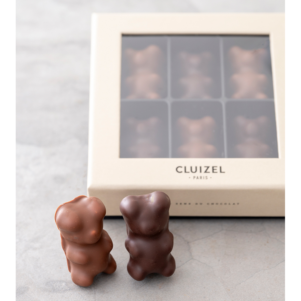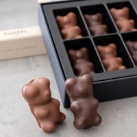 愛らしいくまの形をしたギモーヴを63%のダークチョコレート、39%ミルクチョコレートで丁寧に包み込み、職人の繊細な技がひと粒に込められています。ふんわり、そしてしっとり感もあるギモーブとクリスプなチョコレートの食感もおいしさを際立てます。口に含めば、なめらかにとろけるギモーヴと、チョコレートの芳醇な風味が織りなす上品なハーモニーが広がります。