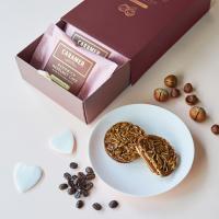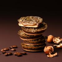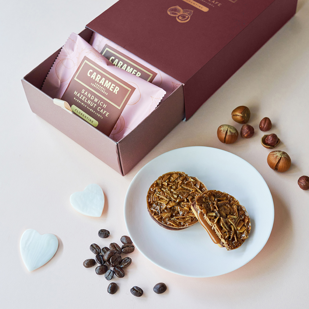 深煎りコーヒーを合わせて焼き上げたアーモンドフロランタンとバターサブレで、とろける食感のヘーゼルナッツキャラメルとミルクチョコレートをサンドしました。