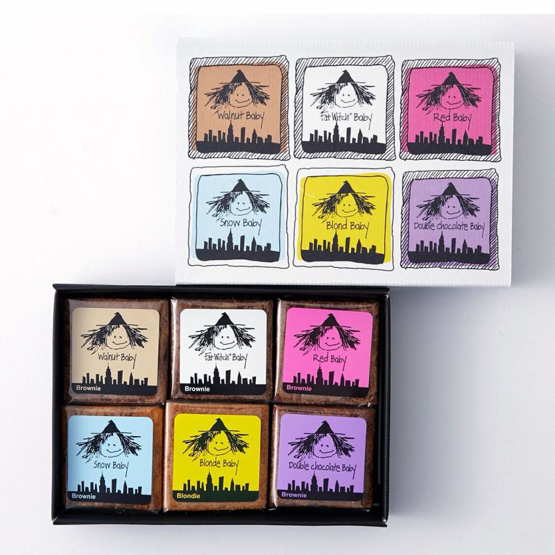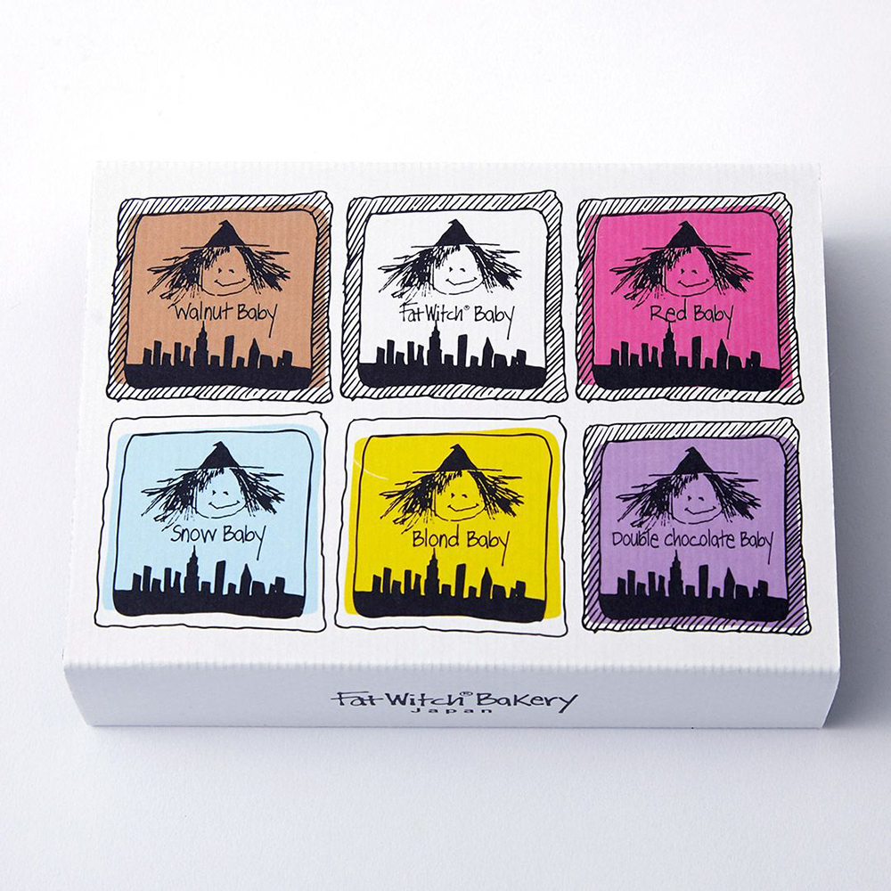 このセットは、王道の「オリジナル(ファットウィッチベイビー)」から、サワーチェリー入りの「レッドベイビー」、アメリカならではのケーキ生地で作られた「ブロンドベイビー」などNY本店の中でも特に人気のフレーバーを厳選した詰め合わせです。ニューヨーク店で定番の「オリジナル」「ダブルチョコ」「ウォルナッツ」「スノー」「ブロンド」「レッド」の6種類