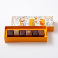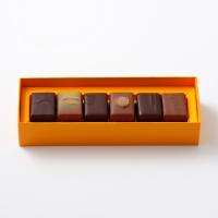 カラメリゼした香ばしいナッツのかりかりした食感とショコラの豊かな風味が楽しめるプラリネです。レモンゼスト入りアーモンドの「マチルダ」、ココナッツの「アカジュー」など、個性溢れる6種の詰め合わせです。