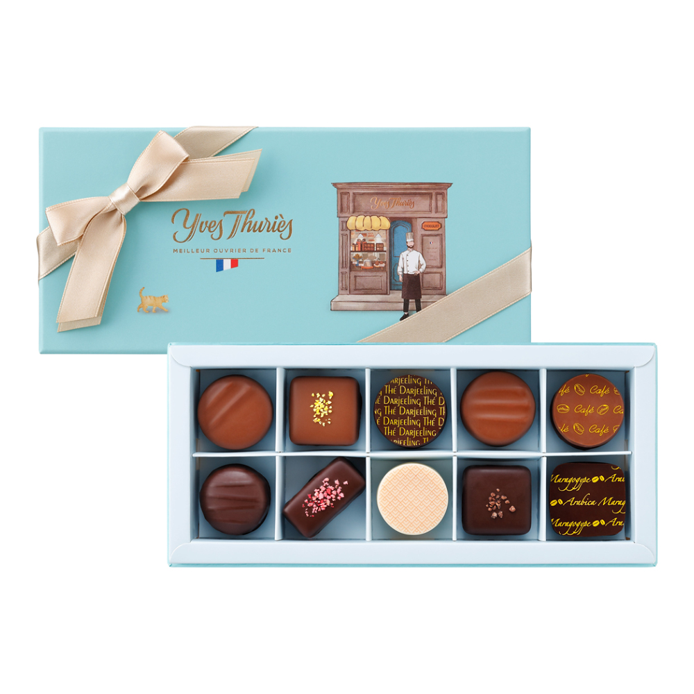 チョコレート10個入(プラリネ・ドゥ・シュド・ウエスト、カフェ・マラゴジーぺ、パレ・ティラミス、エクラ・ドゥ・ノワゼット、クール・パッション、エスプレット、バナン、パレ・テ、ガナッシュ・テ・ジャスマン、パレ・カフェ)