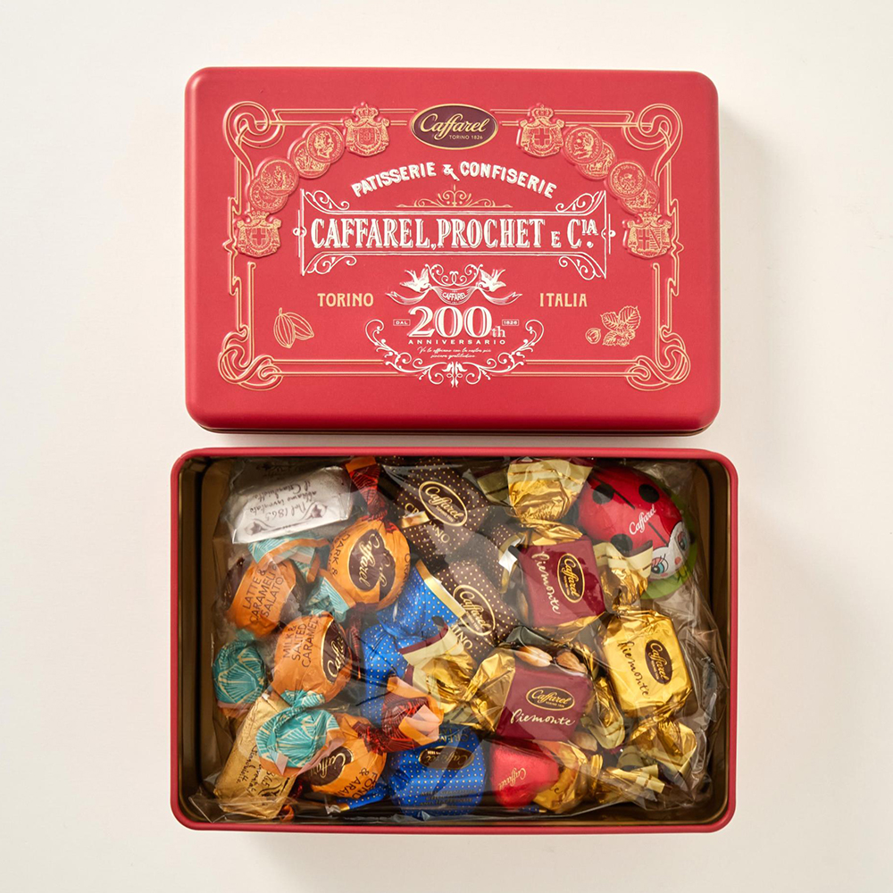 200周年記念デザイン缶に定番のジャンドゥーヤを始めとした合計10種のチョコレートを20粒アソートしています。