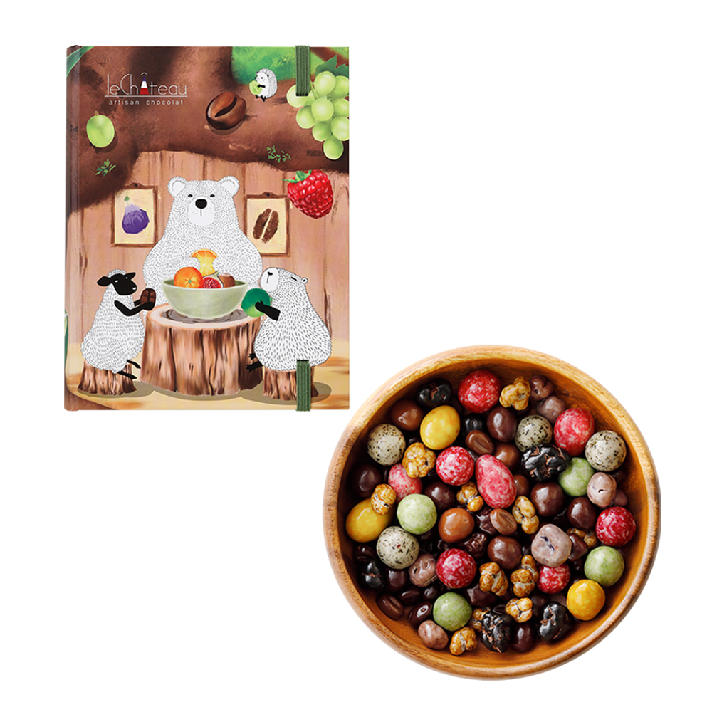 250g[レーズン、イチジク、コーヒー(ミルク/ビーンズ)、ヘーゼルナッツ(ダーク/ミルク)、シリアルボール(ラズベリー/ジャスミンティー/ライム)、オレンジ、クリスピーポップ(塩キャラメル/ブルーベリー)、アーモンド(ストロベリー/パッションフルーツ)]14種