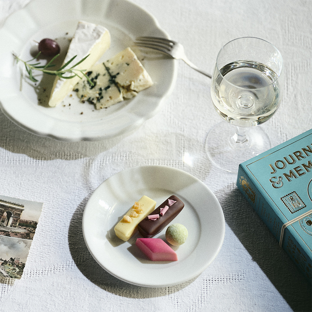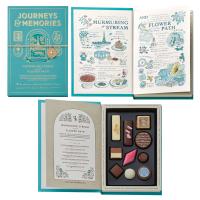 「旅の手記」をイメージしたブック型ボックスに、店主が旅先で見た風景や出会った味わいをチョコレートにして詰め合わせました。ボックスを開くと、それぞれの旅の物語が素敵なイラストで描かれています。まるで一緒に旅するように、新しいチョコレートの体験をお楽しみください。川のほとりで味わった白ワインや、苺のスイーツ、花畑のエルダーフラワーなど、旅先の風景とともに、個性豊かな味わいをお楽しみいただけます。