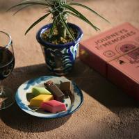 「旅の手記」をイメージしたブック型ボックスに、店主が旅先で見た風景や出会った味わいをチョコレートにして詰め合わせました。ボックスを開くと、それぞれの旅の物語が素敵なイラストで描かれています。まるで一緒に旅するように、新しいチョコレートの体験をお楽しみください。煌めく太陽のような、にぎやかで明るい街への旅を描いたアソートメント。ふりそそぐ太陽のもとで味わったサングリアや、バルで味わった魅惑のアペロ(オリーブ&ペッパー)など、旅先の風景とともに、個性豊かな味わいをお楽しみいただけます。