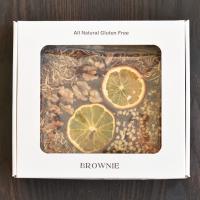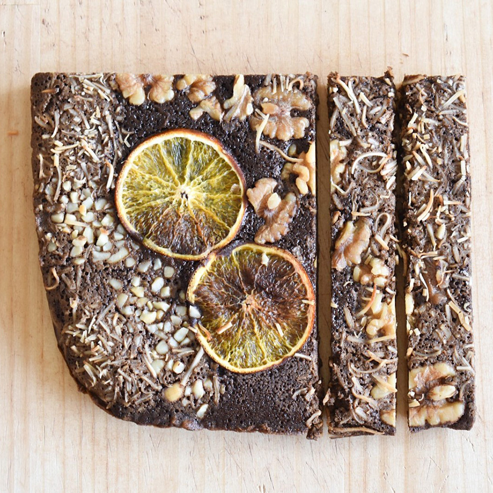黒きなこの生地のブラウニーに、オレンジ・くるみ・カシューナッツ・ココナッツをトッピングしました。好きな大きさに切り分けていろんな味をお楽しみいただけます。お好みで生クリーム・フルーツ・ジャムなどを添えるのもおすすめです。