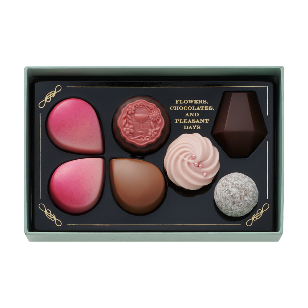 鮮やかな赤色のフルーツと愛らしい花に胸が高鳴る、贅沢な時間。甘いお酒のように、濃密な幸せを誘うひと箱。ローズやカーネーションのフラワーカクテルをイメージした華やかなチョコレートと、キルシュやグリューワイン、あまおう苺など、様々な味わいを詰め合わせました。