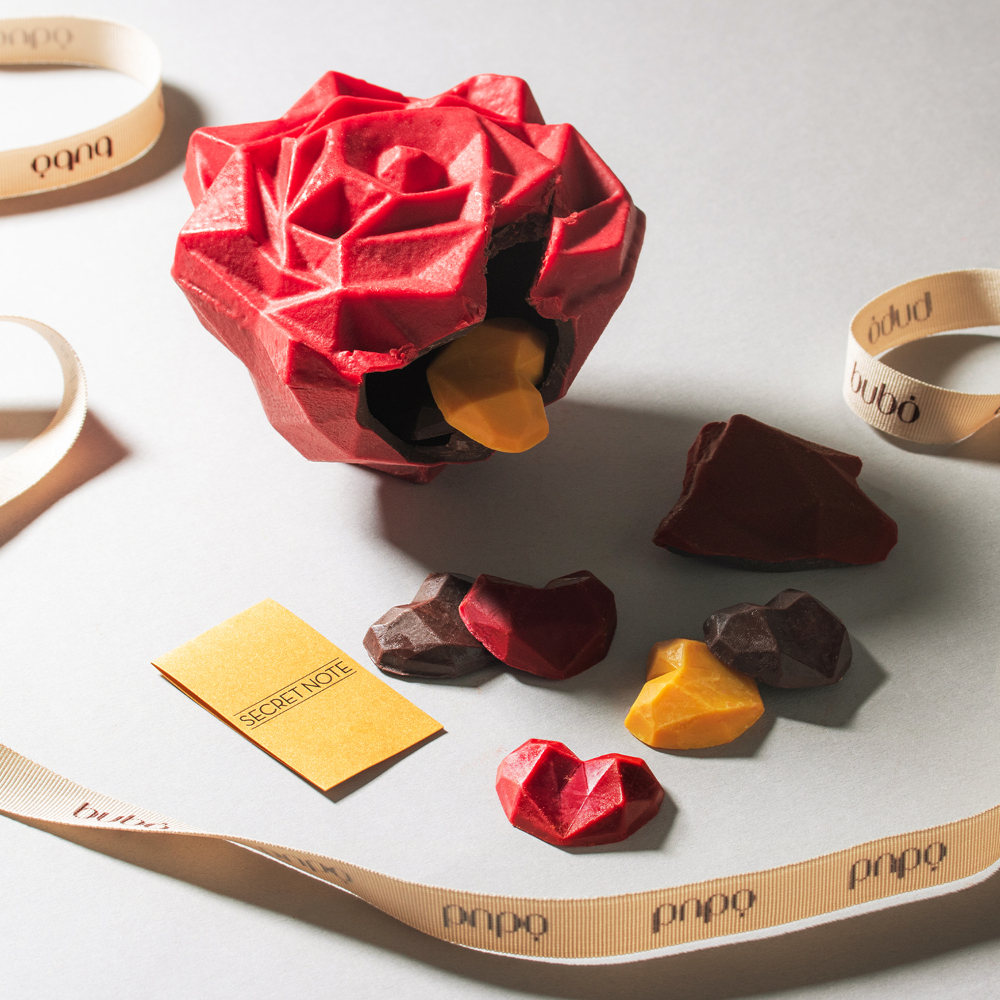 「繊細な味わいと美しさ」を兼ね備えた、スペインを代表するチョコレートブランド「ブボ・バルセロナ」。リボンをほどくと、鮮やかに咲き誇るバラが姿を現し、まるで宝石箱を開けた時のような感動が広がります。ダークチョコレートでかたどったバラの中に、心ときめく3種のハート(ポップロック、マカダム、ブラウニー)を2つずつ詰め込みました。メッセージカードに想いを綴り、バラの中へ添えれば、世界にひとつだけの贈り物に。ジュエリーを選ぶように心を込めて贈りたい、大切な人への特別なひと箱です。