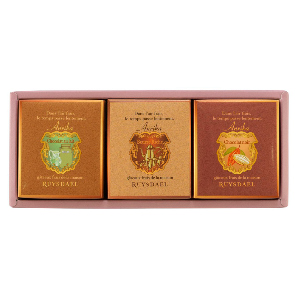 北海道産の発酵バターを使い、芳醇な香りと深みのある味わいに仕上げた「リッチバター」、スポンジケーキでチョコレートガナッシュをサンドしさらにミルクチョコレートでコーティングした「ミルク」、スイートチョコレートでコーティングした「スイート」の冬限定3種類の詰め合わせです。