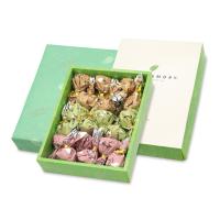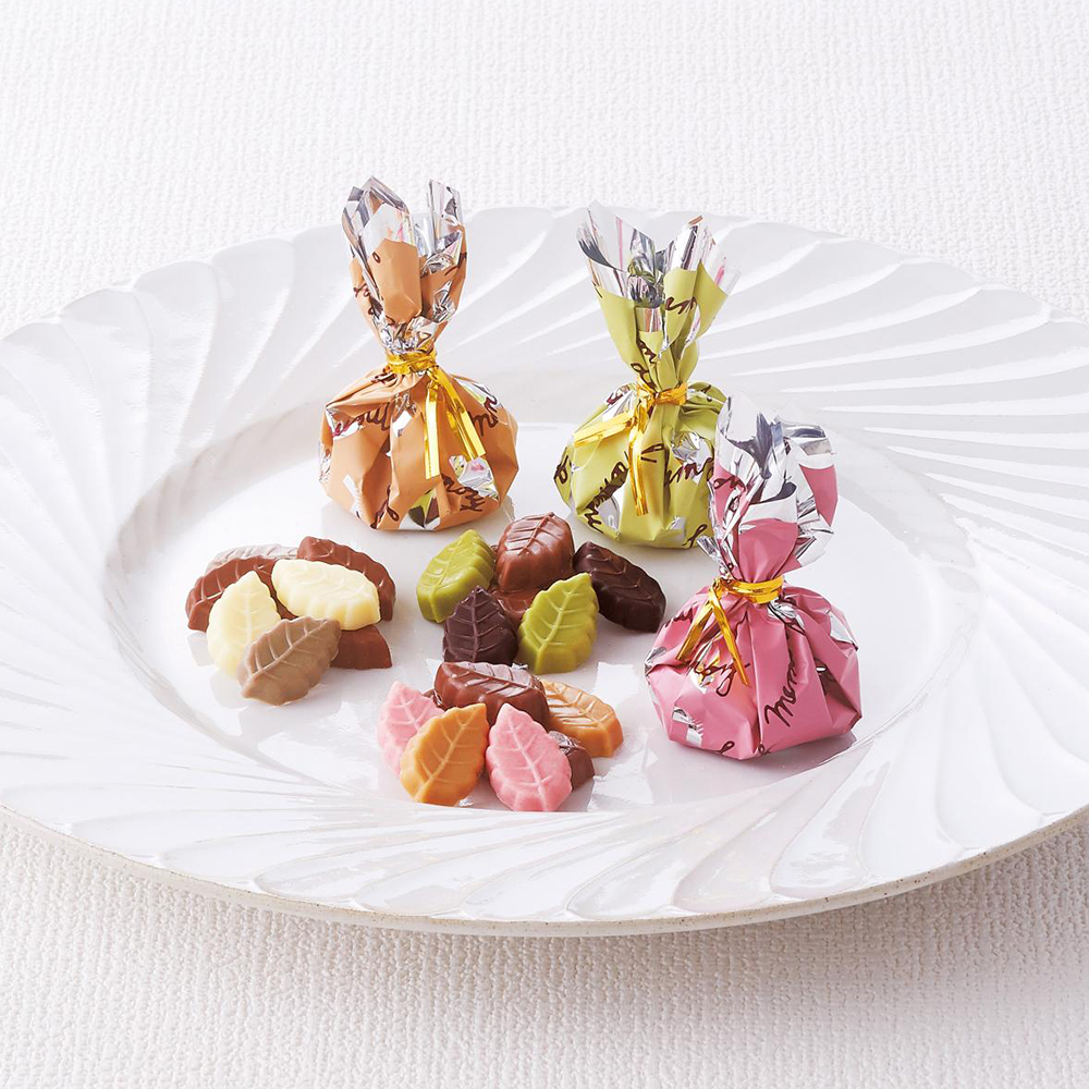 <モンロワール>で人気のチョコレート「リーフメモリー」3色入りのギフトボックス。橙色の巾着はミルク、ホワイト、モカのチョコレート、緑色の巾着は抹茶、ミルク、ダークのチョコレート、桃色の巾着はミルク、キャラメル、クランベリーのチョコレートが入っています。