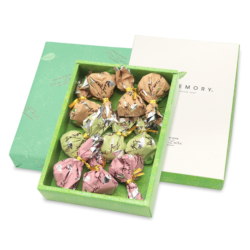 <モンロワール>で人気のチョコレート「リーフメモリー」3色入りのギフトボックス。橙色の巾着はミルク、ホワイト、モカのチョコレート、緑色の巾着は抹茶、ミルク、ダークのチョコレート、桃色の巾着はミルク、キャラメル、クランベリーのチョコレートが入っています。